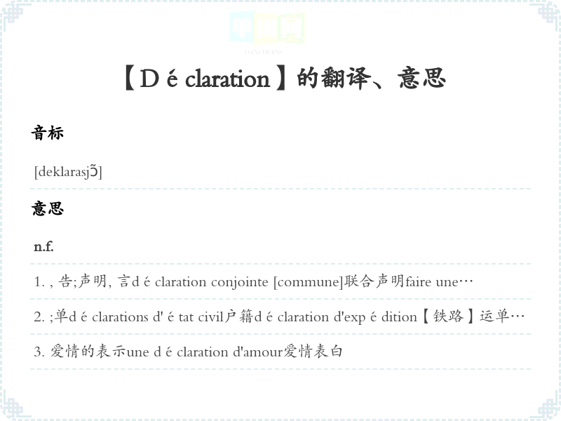 ;单déclarations d'état civil户籍déclaration d'expédition【铁路】运单, 发货单déclaration en douane关单, 海关单déclaration de revenus imposables [d'impôts]所得