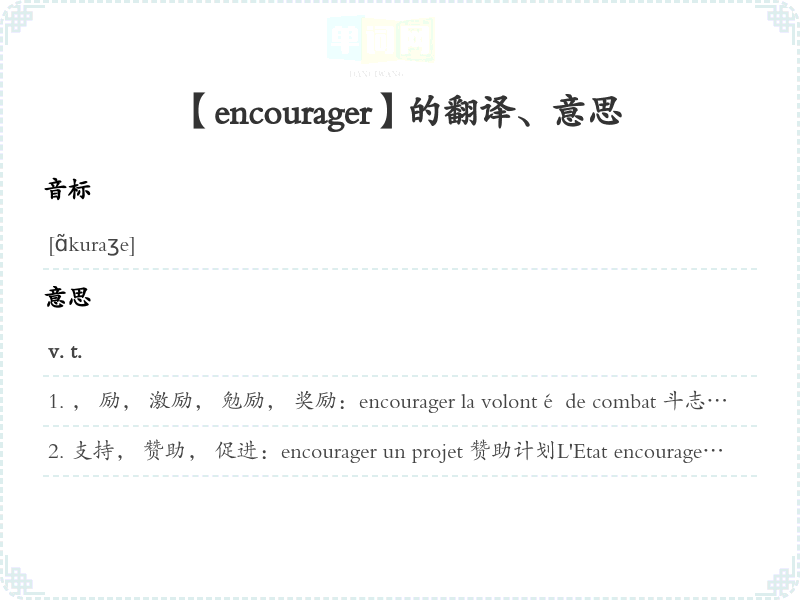 支持, 赞助, 促进:encourager un projet 赞助计划L'Etat encourage l'épargne. 国家励储蓄s'encourager v. pr.互相励, 互相勉励