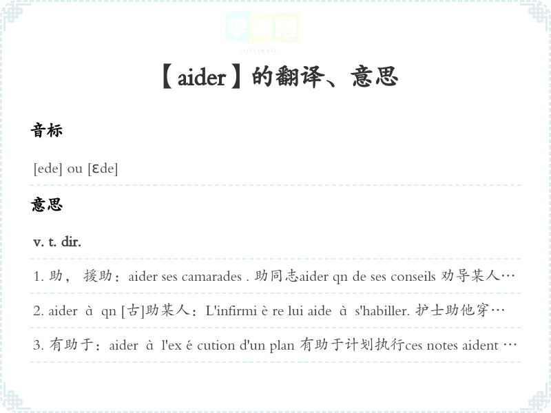 aider à qn [古]助某人:L'infirmière lui aide à s'habiller. 护士助他穿衣服。