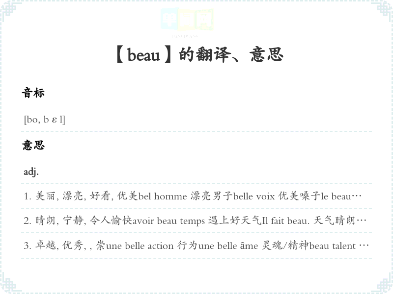 晴朗, 宁静, 令人愉快avoir beau temps 遇上好天气Il fait beau. 天气晴朗une belle occasion 好机会un beau voyage 愉快旅行de beaux résultats 令人满意结果un très beau tableau 很美画le bel âge 青年时代,青春
