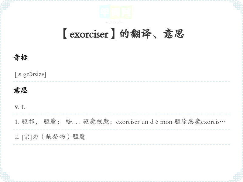 驱邪, 驱魔; 给. . . 驱魔祓魔:exorciser un démon 驱除恶魔exorciser un énergumène 为着魔的人驱邪