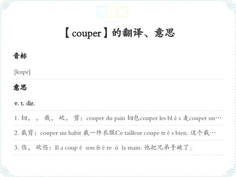 切, , 截, 砍, 剪:couper du pain 切包couper les blés 麦couper un bras 截去一只胳膊couper du bois 伐木couper la tête 杀头, 砍头couper les cheveux à (de) qn 替某人剪头发aller chez le coiffeur se faire couper les cheveux 到理发店去理发couper ras 剃光头couper avec un couteau 用刀切couper un morceau 切一块couper en morceaux 切成块[省略宾语]couper dans le vif, couper jusqu'au vif 到肉里; [转]采取断然措施[转, 俗]à couper au couteau 浓密:brouillard à couper au couteau 浓雾couper la bourse à qn 巧妙地偷某人钱包couper les bras à qn, couper bras et jambes à qn 使某人筋疲力尽; 使某人惊得发呆; 使某人馁couper l'herbe sous les pieds de qn 拆某人墙脚, 排挤某人, 取某人而代之couper le mal à sa racine 根除祸害donner sa tête à couper 用脑袋担保