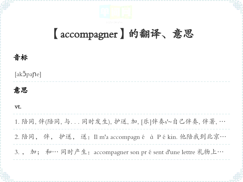 陪同, 伴, 护送, 送:Il m'a accompagné à Pékin. 他陪我到北京。 accompagner un visiteur jusqu'à la porte 送客到门口Tous mes vœux vous accompagnent. 祝你成功
