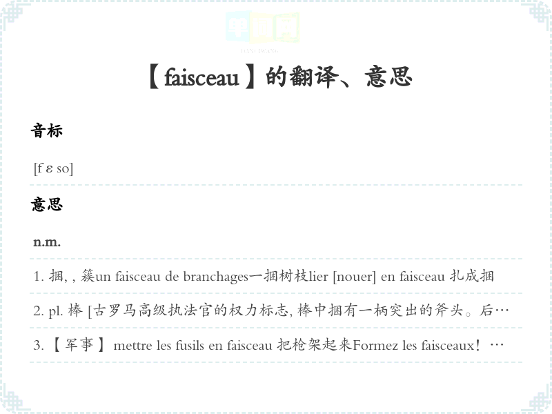 〈比喻〉, 柱, 组faisceau cathodique [électronique]【物理学】电子faisceau laser激faisceau de radiateur散热器芯子组faisceau de voies【铁路】群faisceau fibreux【解剖学】纤维faisceau harmonique【数学】调和()faisceau hertzien【物理学】赫兹电波faisceaux libéro-ligneux【植物学】维管faisceaux lumineux【物理学】, 锥faisceau musculaire【解剖学】肌faisceau nerveux【解剖学】神经faisceau tubulaire管colonne en faisceau 【建筑】簇柱, 集柱