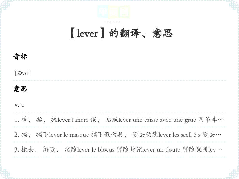 撤去, 解除, 消除lever le blocus 解除封锁lever un doute 解除疑团lever le camp 拔营; [转]离开, 逃跑lever une interdiction 取消禁令lever les obstacles 排除障碍lever la séance 宣布散会lever la sentinelle 撤除哨兵lever le siège 撤围; [转, 俗]走开, 离去