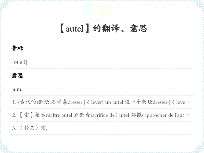 (古代的)祭坛;石供桌dresser [élever] un autel 设一个祭坛dresser [élever] des autels à qn〈引申义〉把某人奉若神明