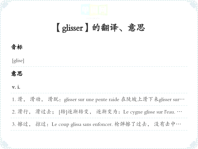 悄悄地说:glisser un mot à l'oreille de qn 在某人耳悄悄地说一句话se glisser v. pr.溜, 钻:se glisser dans ses draps 钻进被窝里。 Les serpents se glissent dans les hautes herbes. 蛇钻进深草里。 (用作impers. ) Il s'est glissé quelques fautes dans l'impression de ce livre. 在这本书中出了几个印刷上错误。