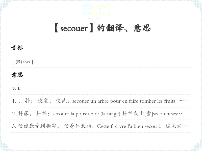 【secouer】 助记:、 词根:、 联想:、 近义词:、 反义词: 联想词