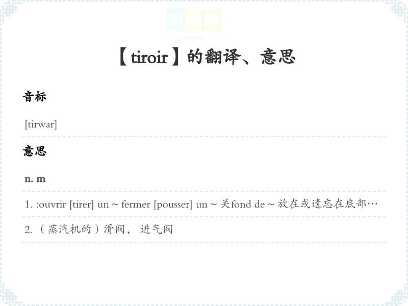 :ouvrir [tirer] un ~ fermer [pousser] un ~ 关fond de ~ 放在或遗忘在底部的东西;<引>无价值的陈旧物,老古董pièce à ~ 插曲剧nom à ~s <口>复合名字[指姓或名较长的人名]口>引>