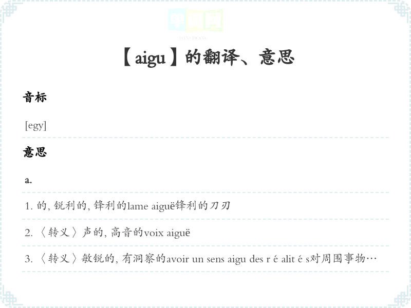 〈转义〉锐的, 激烈的, 剧烈的conflit aigu 锐的冲突douleur aiguë剧烈的痛苦