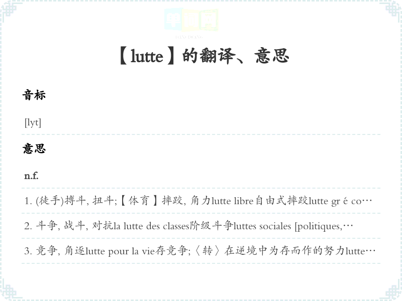 竞争, 角逐lutte pour la vie存竞争;〈转〉在逆境中为存而作的努力lutte entre le bien et le mal善恶之争de vive lutteloc.adv.用力地, 大力地, 通过不懈的努力enlever de haute lutte une position ennemie全力拔除敌军据点