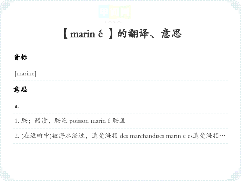 (在运输中)被海水浸过,遭受海损 des marchandises marinées遭受海损货物café mariné经海水浸过咖啡