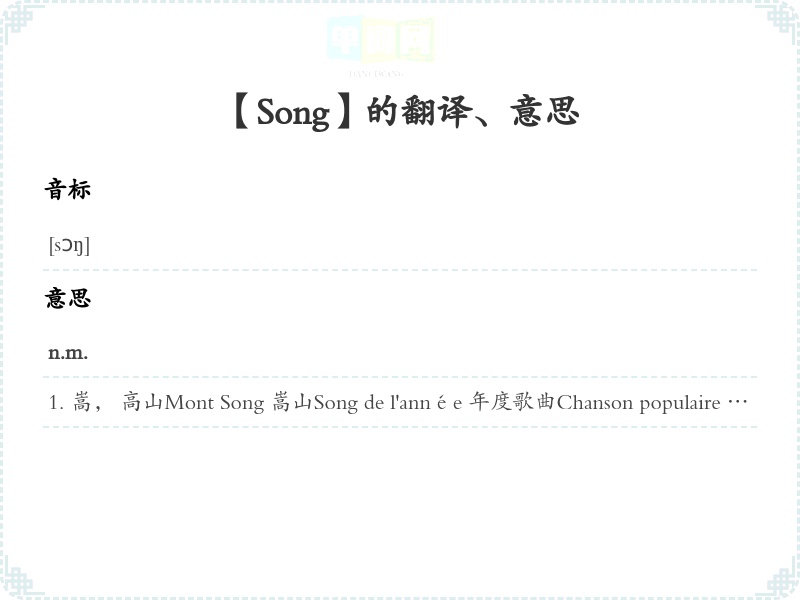 【Song】 助记:、 词根:、 联想、 名词化:、 词化:、 形容词化:、 近义词、 反义词、 同音、近音词 联想词