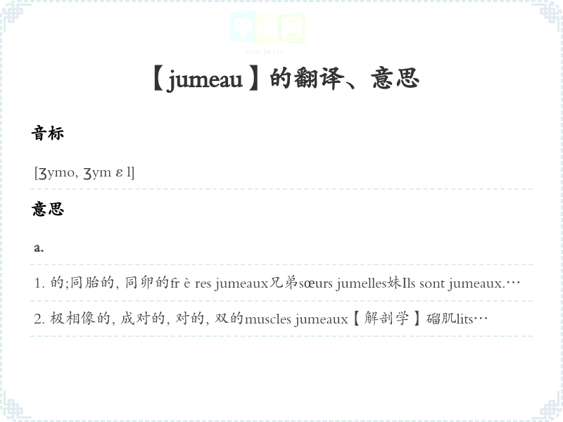 的;同胎的, 同卵的frères jumeaux兄弟sœurs jumelles妹Ils sont jumeaux.他们是双胞胎。des chiens jumeaux同胎的狗