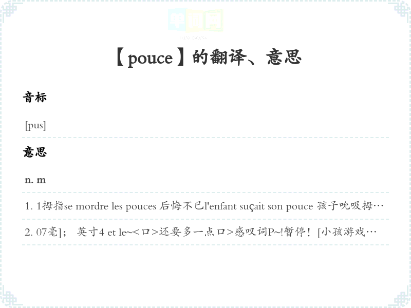 1拇指se mordre les pouces 后悔不已l'enfant suçait son pouce 孩子吮吸拇指2大趾3法寸[法国古长度单位, 等于 1/12法尺, 约合2