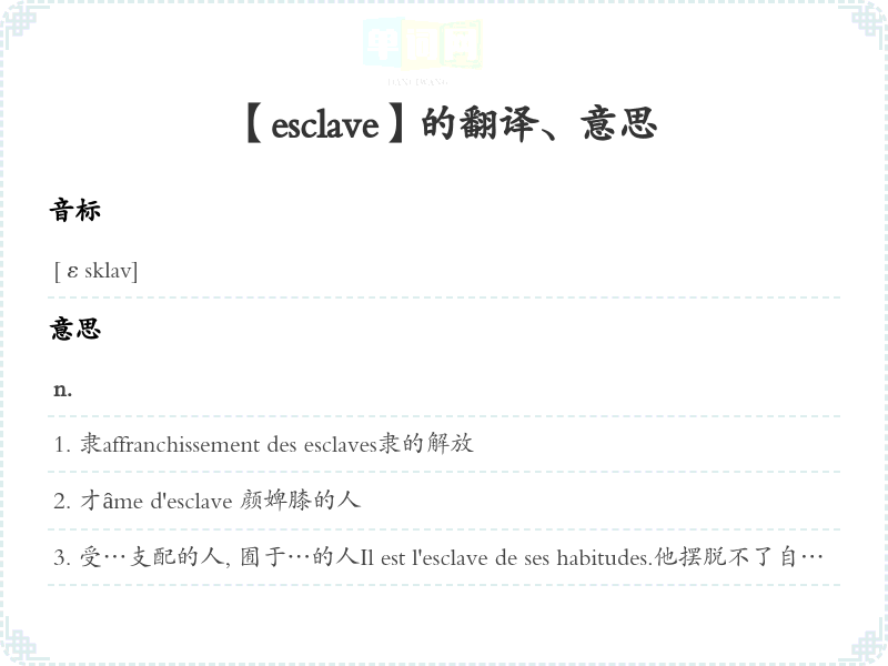 受…支配的人, 囿于…的人Il est l'esclave de ses habitudes.他摆脱不了自己的习惯。les esclaves de l'argent金钱的隶— a.受役的, 受支配的, 盲目服从的être esclave de qn盲目服从某人, 是某人的隶être esclave de son devoir务缠身