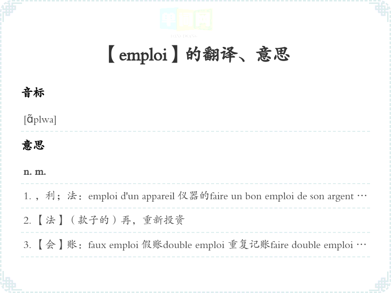 ,利;法:emploi d'un appareil 仪器的faire un bon emploi de son argent 花钱很得当faire emploi de la force 诉诸武力,力mode d'emploi 方法,法说明emploi du temps 时间表,作息时间表,课程表,日程表