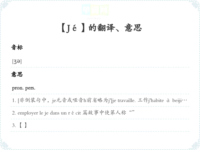 [非倒装句中,je元音或哑音h前省略为j']je travaille. 工作j'habite à beijing 住北京n.m.inv.