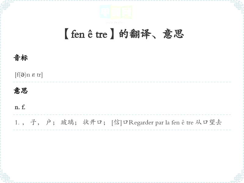 【fenêtre】 联想:、 名词化:、 形容词化:、 近义词: 联想词