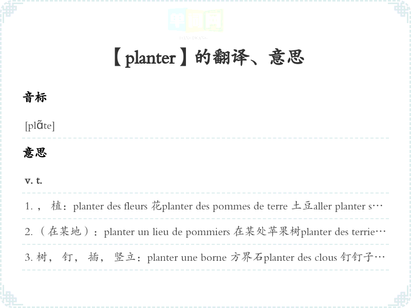 【planter】 派生:、 联想:、 近义词:、 反义词: 联想词