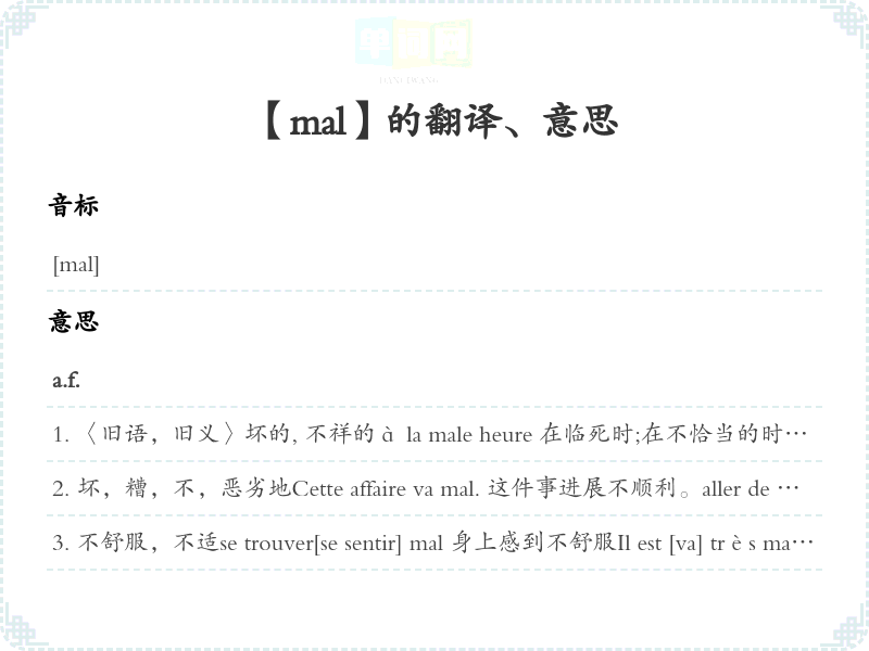 疼痛,不适souffrir d'un mal de dents 牙痛mal des montagnes [de l'altitude] 高山avoir mal au cœur 恶心mal de mer[de l'air,de la route] 晕船/飞机/车faire mal à qn 使某人受伤, 弄痛某人Cela me fait mal de voir [d'entendre] cela.〈转义〉〈口语〉看到 [听到] 这个真使我难受。se faire mal en tombant 摔跤受伤