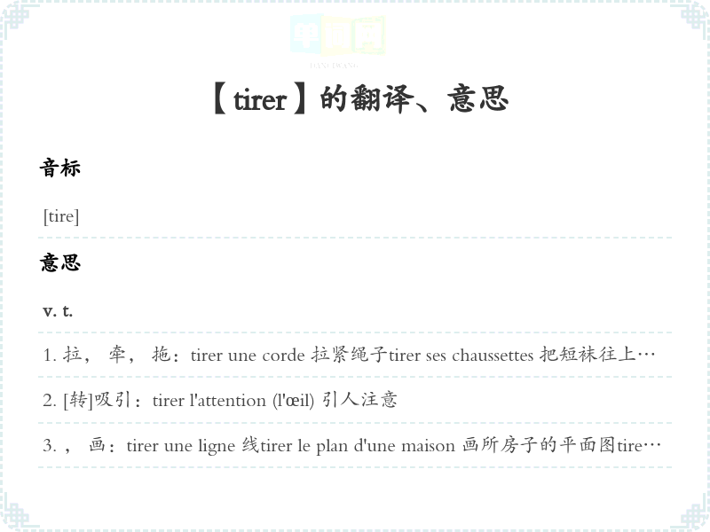 拉, 牵, 拖:tirer une corde 拉紧绳子tirer ses chaussettes 把短袜往上拉拉挺tirer les oreilles à qn 拉某人的耳朵se faire tirer l'oreille [转]让人再三请求, 轻易同意tirer ses chausses (ses grègues) [转]逃跑tirer la sonnette d'alarme 拉响报警铃tirer le fils des marionnettes 拉木偶的线tirer les cordes (les ficelles) [转]暗中操纵, 幕后策tirer qch en longueur 把某事拖得很久tirer du métal en fils 把金属拉成丝tirer qn par le bras 拉某人的胳膊tirer un tiroir 拉开抽屉tirer un rideau 拉帘子[拉开或拉上]tirer l'échelle 挪开梯子[使再靠墙]Après celui-là, il faut tirer l'échelle. [转]再没有比他更行的了。 tirer une porte dernière (après) soi把门随手拉上tirer l'aiguille [引]针线活儿tirer la couverture à soi 独占好处; 把最大的份占为已有tirer un texte à soi 把篇文章作有利于自己的解释cheval qui tire une voiture 拉车的马tirer la jambe (由于疲乏等原因)拖着腿走路