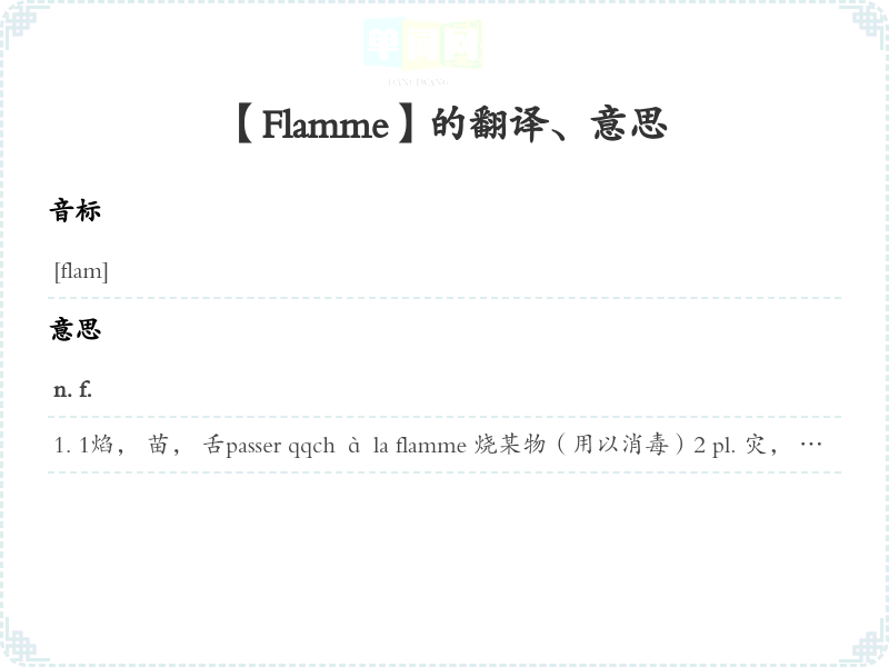 【Flamme】 助记:、 词根:、 派生:、 联想:、 近义词:、 反义词: 联想词