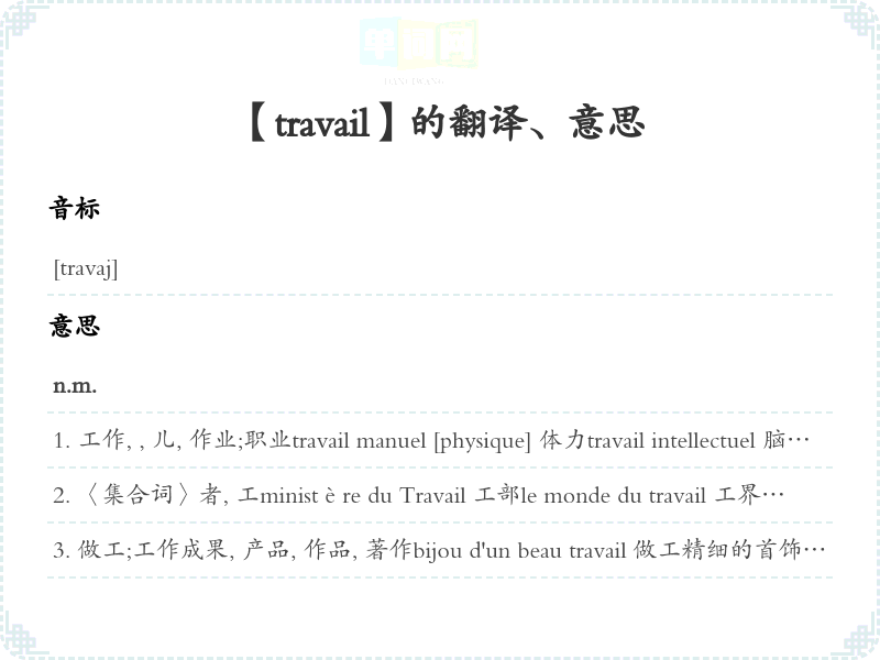 做工;工作成果, 产品, 作品, 著作bijou d'un beau travail 做工精细的首饰travaux d'art 公共工程建筑物 [指桥梁、铁路、运河等]travaux historiques 历史著作Montrez-moi votre travail. 把您做的东西拿给我看看。C'est du travail d'amateur. 这是外行干的儿。 [喻做得粗劣]