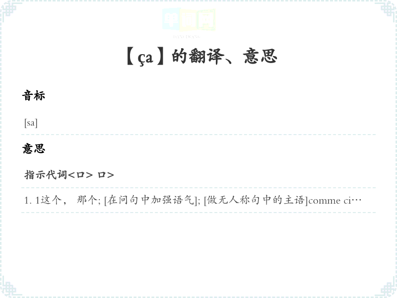 1这个, 那个; [在问句中加强语气]; [做无人称句中的主语]comme ci comme ~ 马马虎虎2<贬>这些家伙贬>n. m. inv.本 [弗洛伊德以及其弟子们的语汇,指在无意识领域内被压抑的人的本能和欲望,本与、构成人格的三个基本力量]