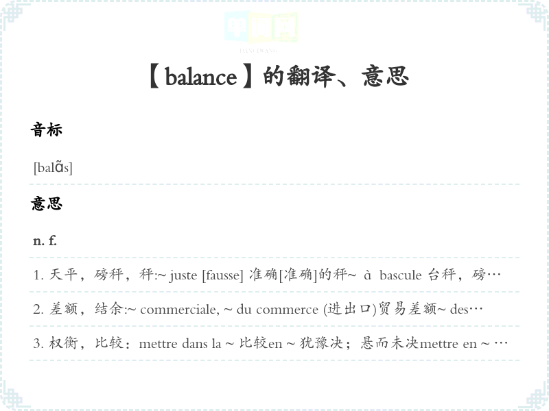 【balance】 联想:、 形容词变化:、 近义词: 联想词