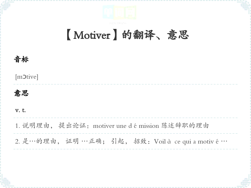 是…的理由, 证明 …正确; 引起, 招致:Voilà ce qui a motivé notre décision. 这就是促使做出决定的原因。 Rien ne motive cette mesure. 什么样也不能证明这个措施是必要的。3使有积极性, 使有干劲; 刺