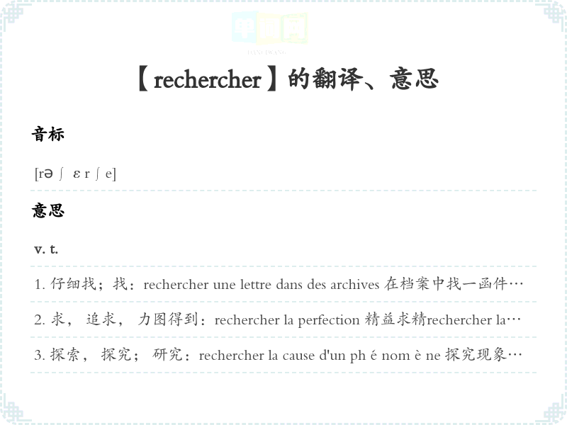 探索, 探究; 研究:rechercher la cause d'un phénomène 探究现象的原因 rechercher un nouveau procédé de fabrication 研究新的制造方法