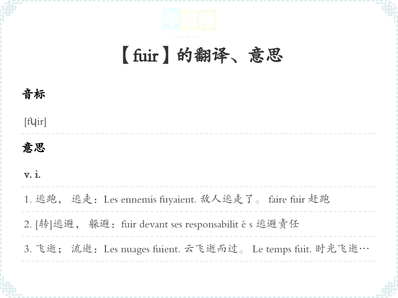飞逝; 流逝:Les nuages fuient. 云飞逝而过。 Le temps fuit. 时光飞逝。 L'hiver a fui. 冬日已过。