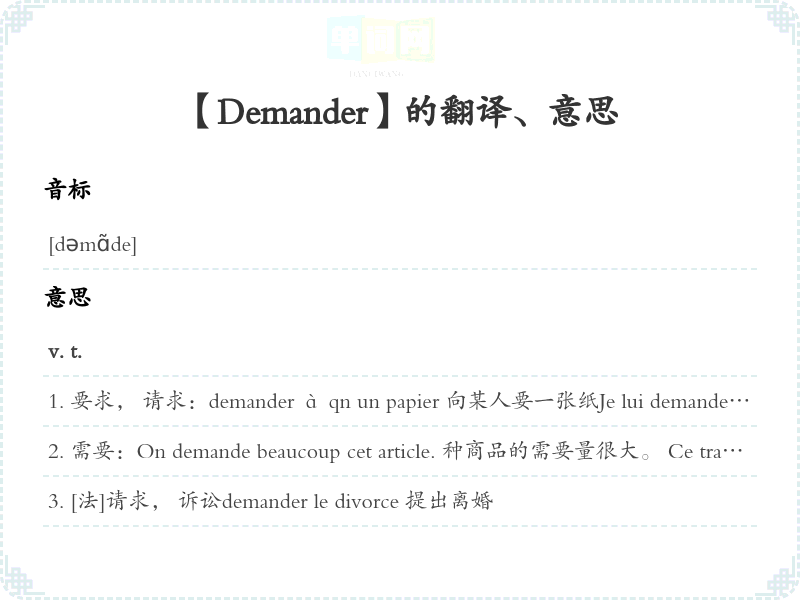 【Demander】 助记:、 派生:、 联想:、 用法:、 名词变化:、 形容词变化:、 近义词:、 反义词: 联想词