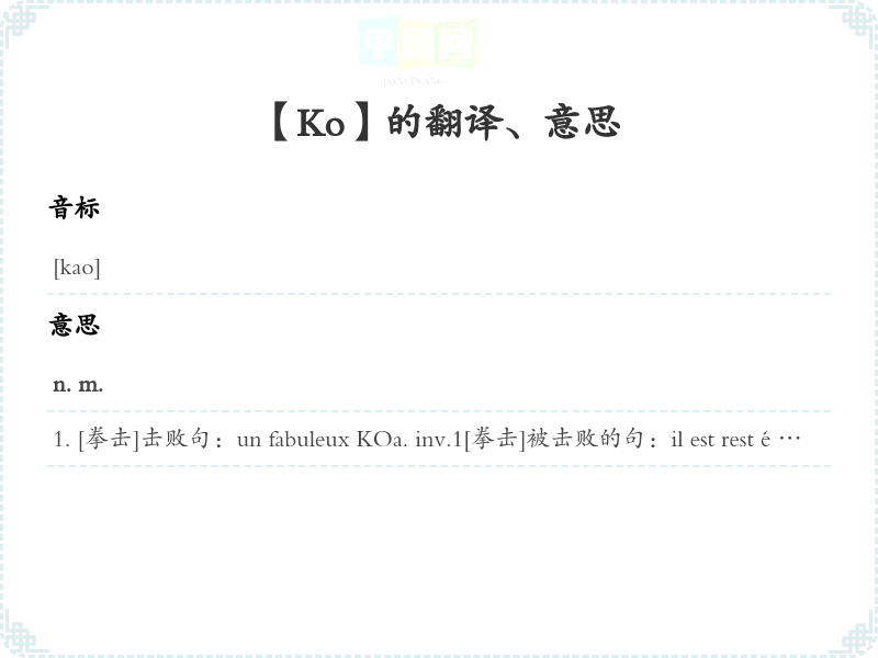 [拳击]击败句:un fabuleux KOa. inv.1[拳击]被击败的句:il est resté KO2[俗]疲倦的, 精疲力尽的句:la canicule l'a mise KO