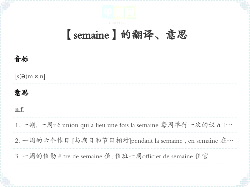 一期, 一周réunion qui a lieu une fois la semaine 每周举行一次的议à la fin de la semaine prochaine在下周末fin de semaine 周末 [加拿大用语]la semaine des quatre jeudis〈口语〉永远不的日子la semaine sainte(天主教)圣周, 复活节前的一周semaine anglaise(期六下午或全日和期日均休息的)双休日作制 [最初在英国采用]dans une semaine [deux semaine s] à compter d'aujourd'hui从今天算起一期 [两期] 后chambre louée à la semaine 按期出租的房间prêter à la petite semaine 〈旧语,旧义〉短期高利出借une politique à la petite semaine 无远见的权宜政策