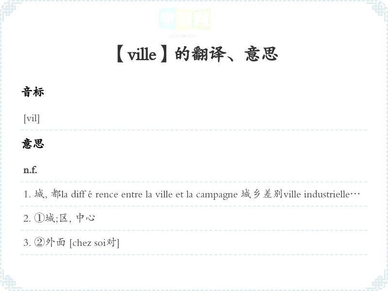 【ville】 联想:、 近义词:、 反义词: 联想词