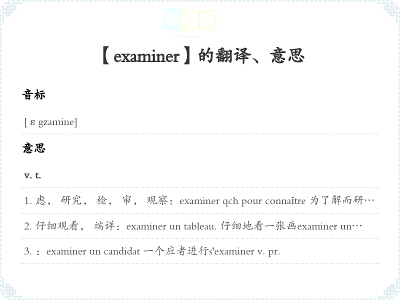 虑, 研究, 检, 审, 观察:examiner qch pour connaître 为了解而研究某事物examiner une affaire en comité 凑在一起研究一件事examiner si (comment, pourquoi) … 虑是否[如何, 为何]…, 如何, 为何] …examiner un malade. 检一个病人Nous devons examiner les questions sous tous leurs aspects. 我们必须全面地看问题。