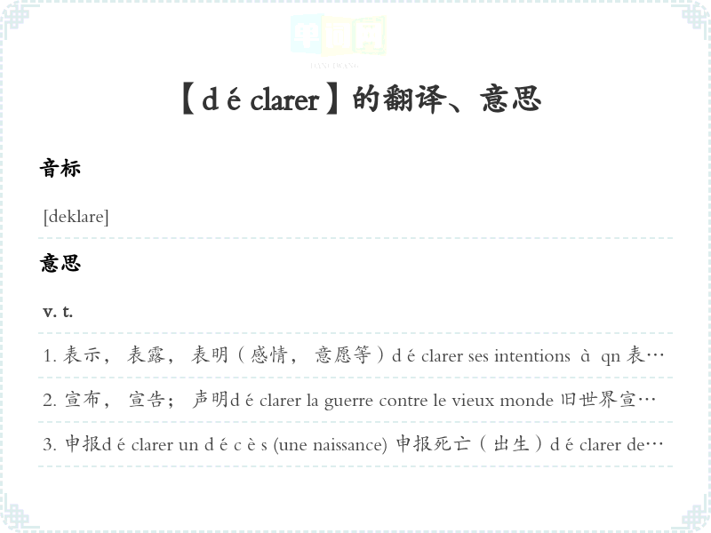 宣布, 宣告; 声明déclarer la guerre contre le vieux monde 旧世界宣战déclarer la séance ouverte 宣布开会déclarer qn innocent 宣布无罪Je déclare que je n'accepterai aucun compromis. 我宣布不接受任何妥协方案