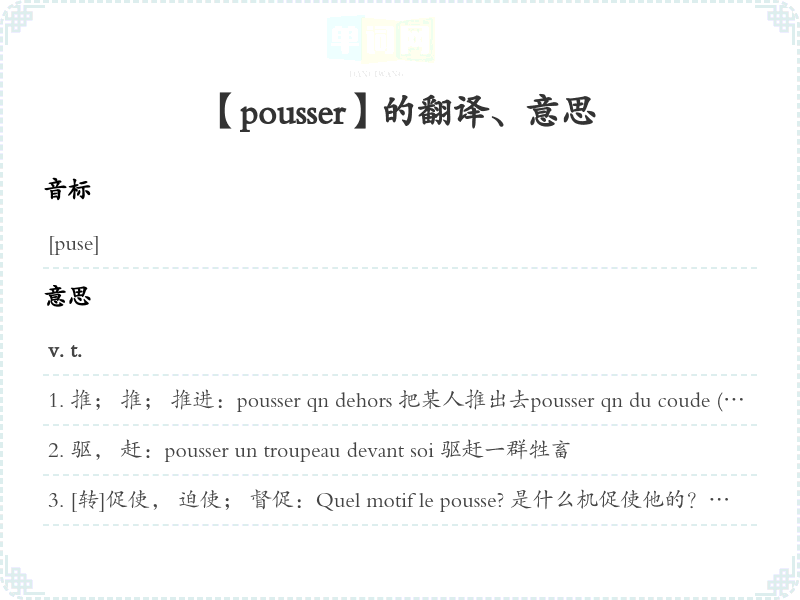【pousser】 助记:、 词根:、 派生:、 用法:、 名词变化:、 形容词变化:、 近义词、 反义词、 同音、近音词 联想词