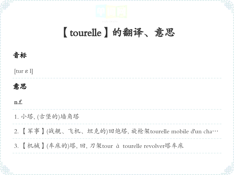 【机械】(车床的)塔, 回, 刀架tour à tourelle revolver塔车床