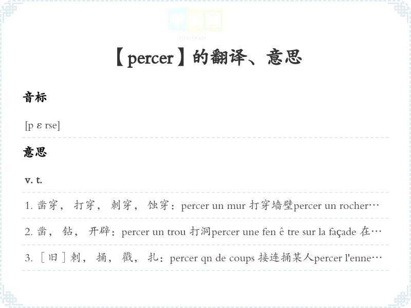 穿过, 透过, 冲破, 破:percer la foule 穿过人群percer le front ennemi 破敌军阵线hurlements qui percent les oreilles 剌耳的嚎叫声La pluie a percé tous mes habits. 雨把我的衣服淋透湿。 Le soleil perce les nuages. 阳光透过云层。