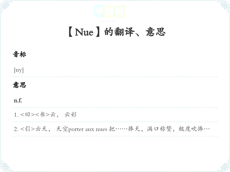 <引>云天, 天空porter aux nues 把……捧天,满口称赞,极度吹捧tomber des nues 极度惊讶,惊惶失措,大吃一惊se perdre dans les nues 坠入五里雾中引>书>旧>