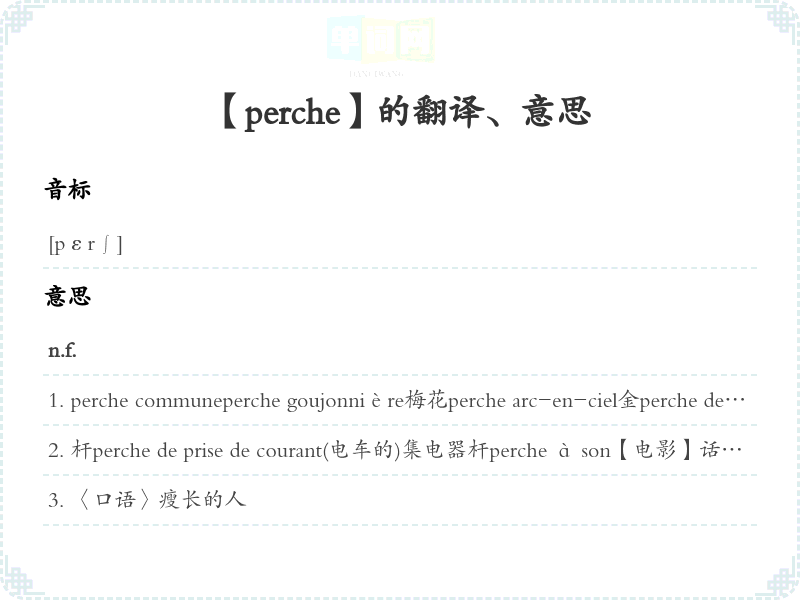 杆perche de prise de courant(电车的)集电器杆perche à son【电影】话筒吊杆saut à la perche 【体育】撑杆跳高conduire un bateau à la perche 用篙撑船tendre la perche à qn〈转义〉拉某人一把