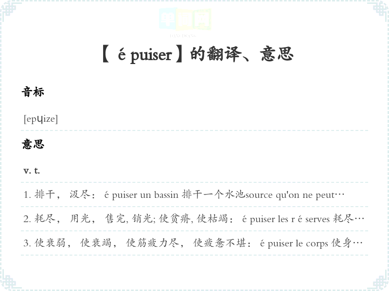 【épuiser】 派生:、 联想:、 近义词:、 反义词: 联想词