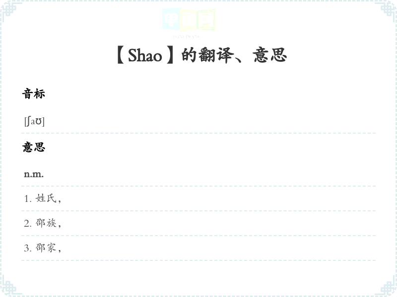 【Shao】 助记:、 词根:、 联想、 名词化:、 词化:、 形容词化:、 近义词、 反义词、 同音、近音词 联想词