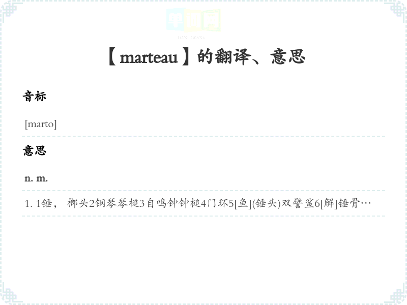 1锤, 榔头2钢琴琴槌3自鸣钟钟槌4门环5[鱼](锤头)双譬鲨6[解]锤骨7[体]链球:lancement du~掷链球a.être~[俗]神经有点不正常