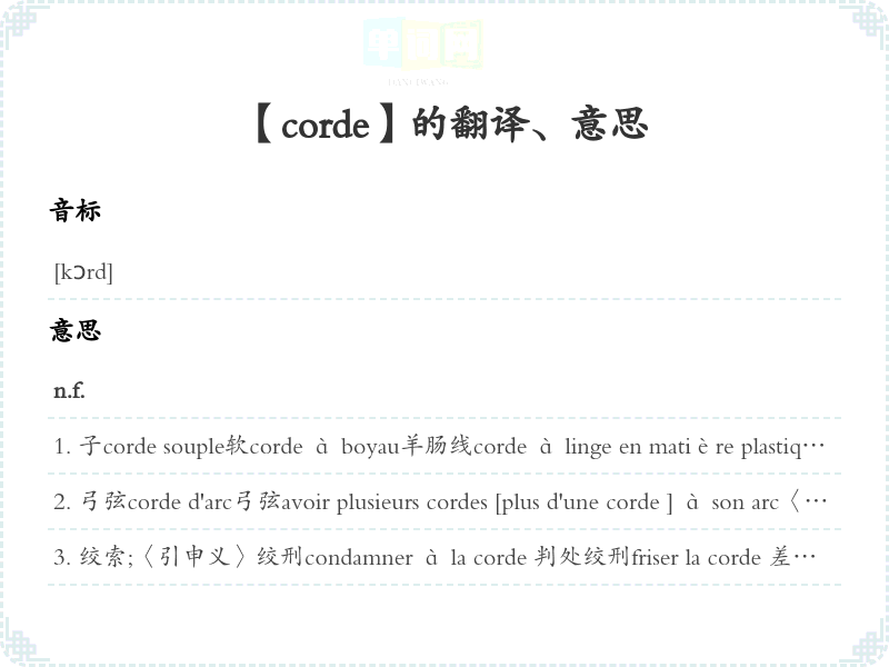 绞索;〈引申义〉绞刑condamner à la corde 判处绞刑friser la corde 差点被判绞刑;应判绞刑homme de sac et de corde 十恶不赦的坏蛋Il ne vaut pas la corde pour le pendre.绞死他还嫌浪费了子。 [喻十恶不赦, 卑鄙透顶]se mettre la corde au cou使自己陷入不能自主的困难境地;〈讽刺语〉结婚成家Il ne faut point parler de corde dans la maison d'un pendu.在有人吊死过的家别提子。 [喻讲话要看对象场合]