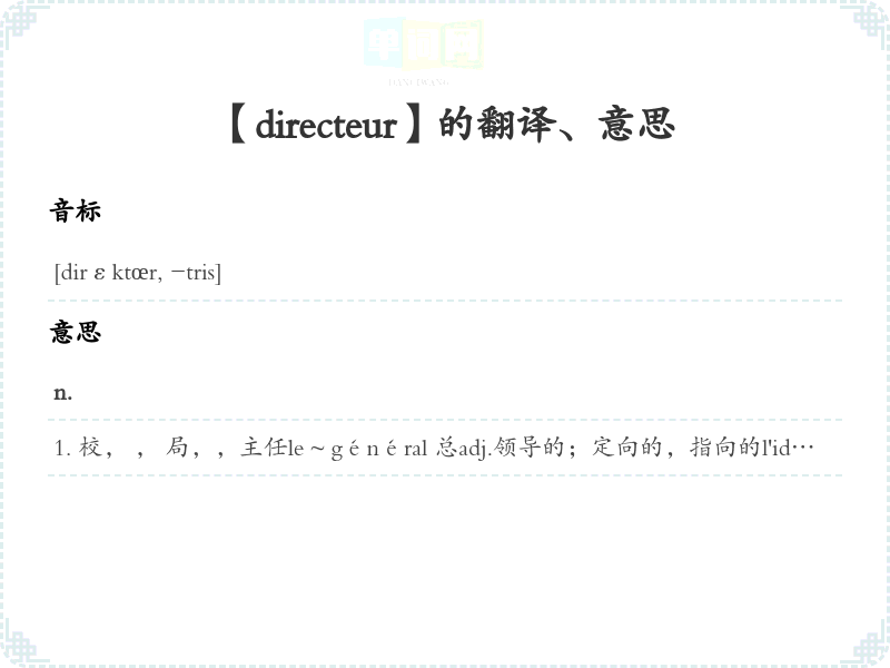 校, , 局,,主任le ~ général 总adj.领导的;定向的,指向的l'idée directrice 指导思想le comité directeur 指导委员会