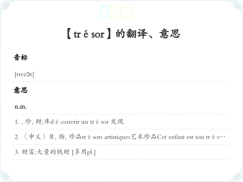 【trésor】 联想:、 名词变化:、 近义词: 联想词